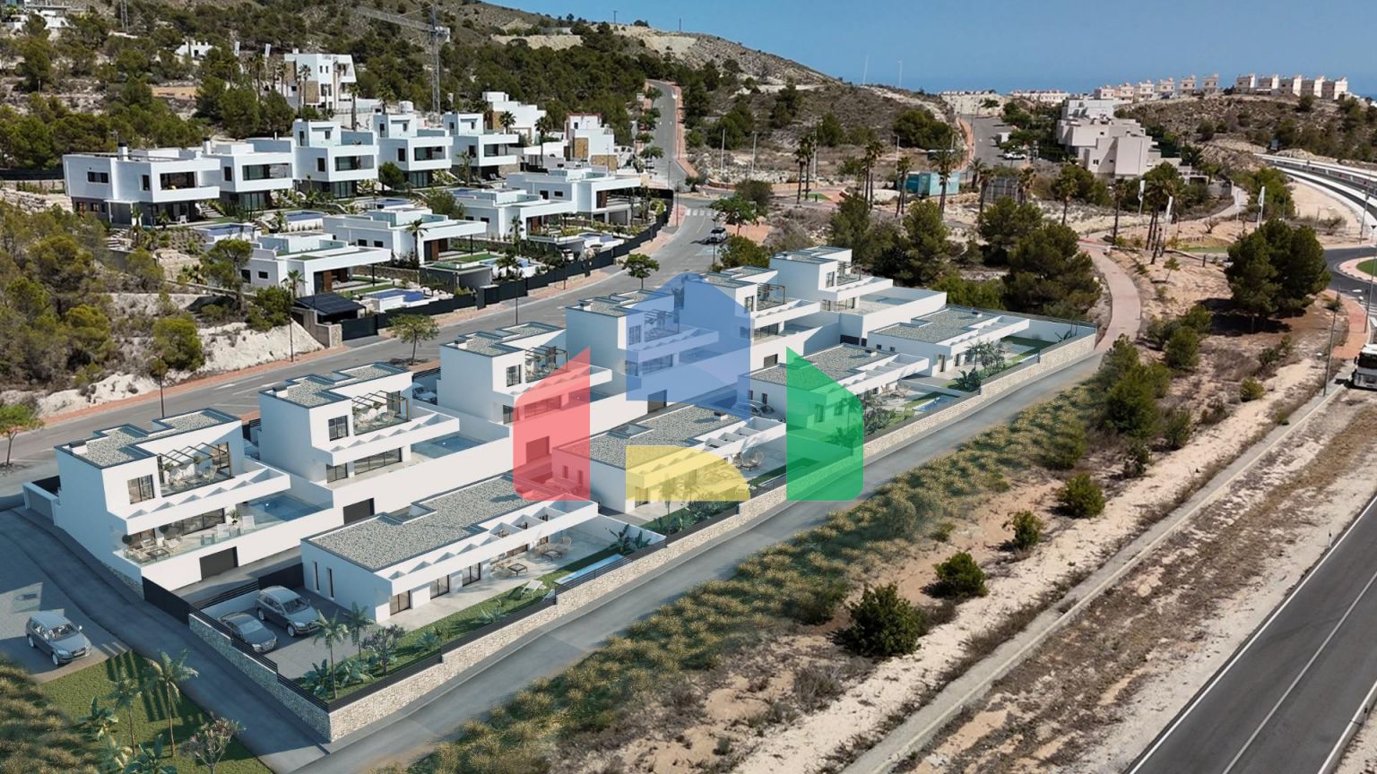 Puig Campana Villas is located in a privileged environment on the Costa Blanca, in an elevated area at the foot of the mountains, surrounded by nature and other similar urbanizations, with excellent views of the sea and its surroundings. Very well connected by road to the nearby town of Finestrat, 10 minutes by car from the shopping centers, the A7 motorway, the beaches and the nearby towns of Benidorm and Villajoyosa, and 30 minutes from the city of Alicante and its international airport.