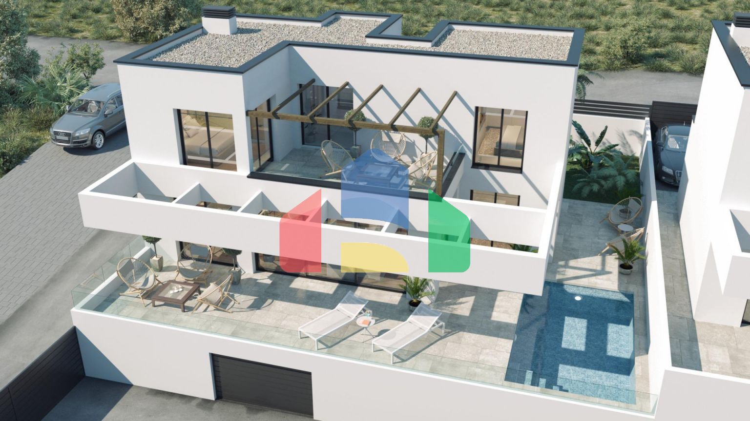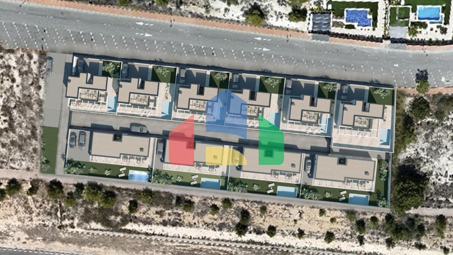 The project will be divided into two construction phases, which in turn includes two types of homes, 1 or 2 floors, 3 double bedrooms, 2 or 3 full bathrooms, living room with integrated kitchen, laundry room, large terrace and garden, private pool, outdoor parking, 1 or 2 multipurpose basements and in some models a closed underground garage.