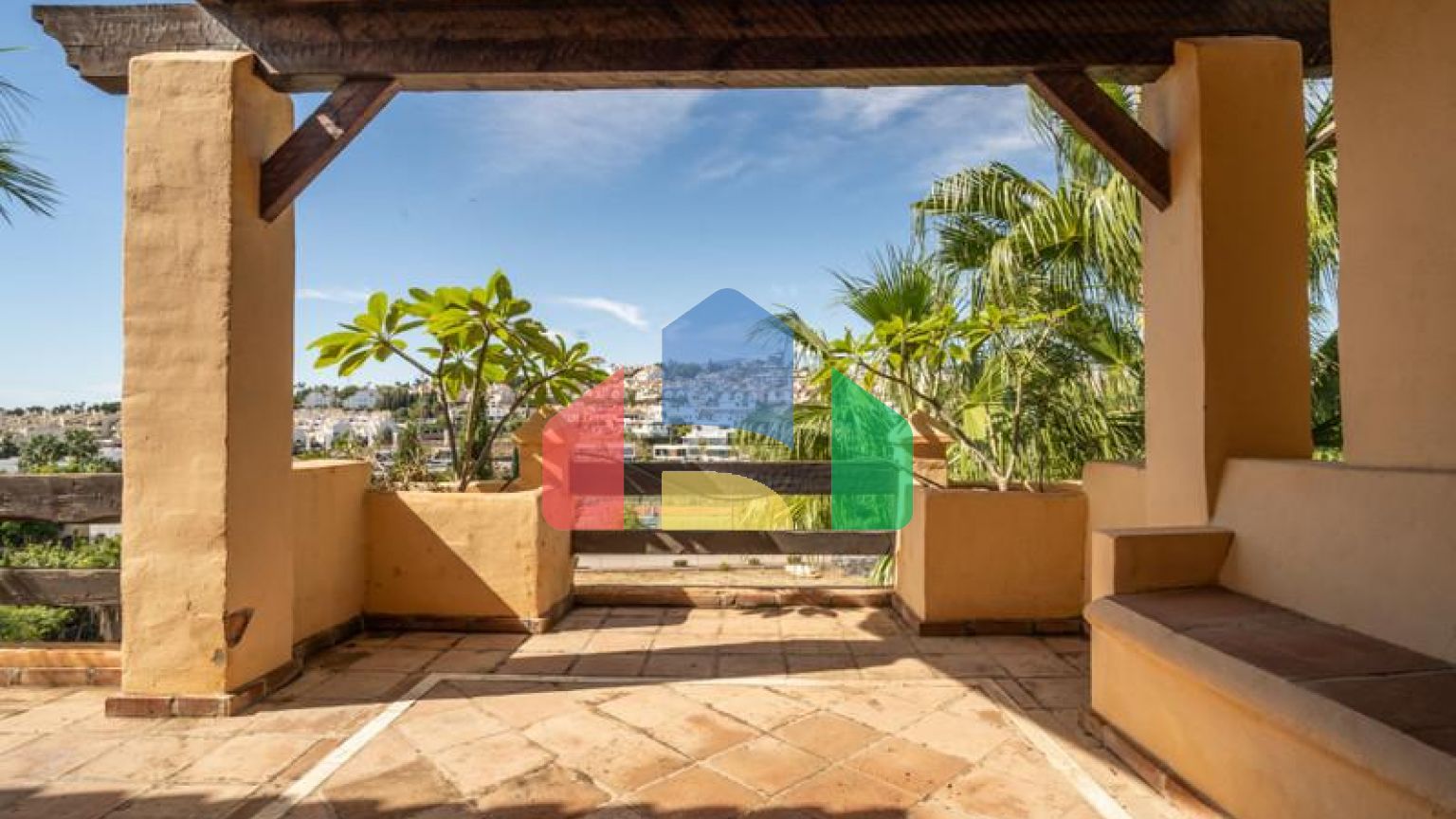 Терасса площадью 20 м² идеально подходит для отдыха на свежем воздухе, с достаточным местом для обеденной зоны или зоны отдыха, идеально подходящей для наслаждения средиземноморским климатом и видом на общие сады.