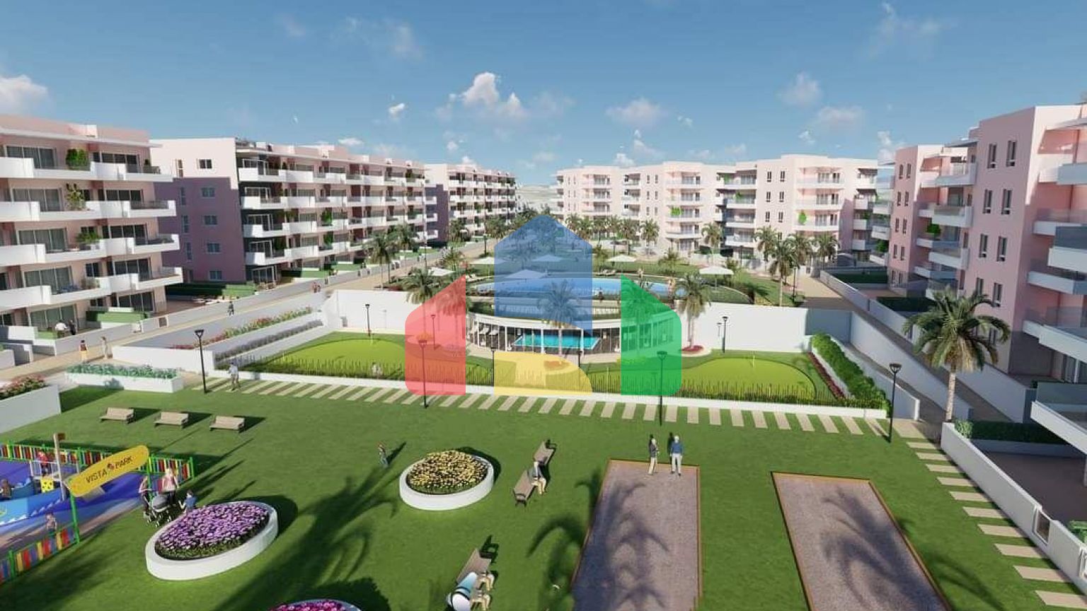 Комплекс с бассейном, зелеными зонами, полями для гольфа, СПА, детской площадкой, биотуалетами и спортивными площадками.