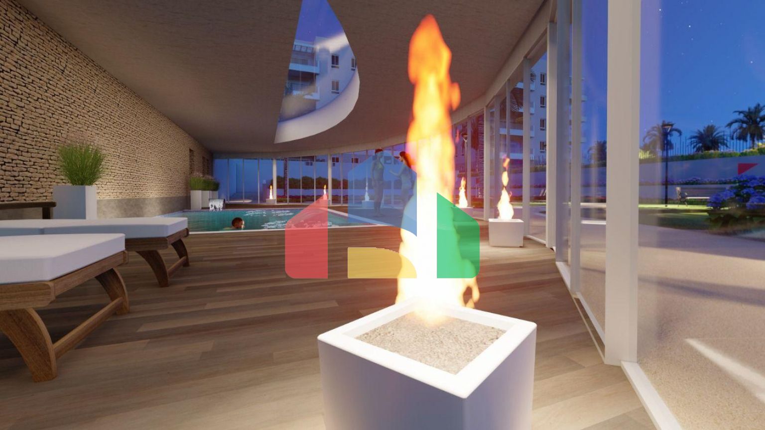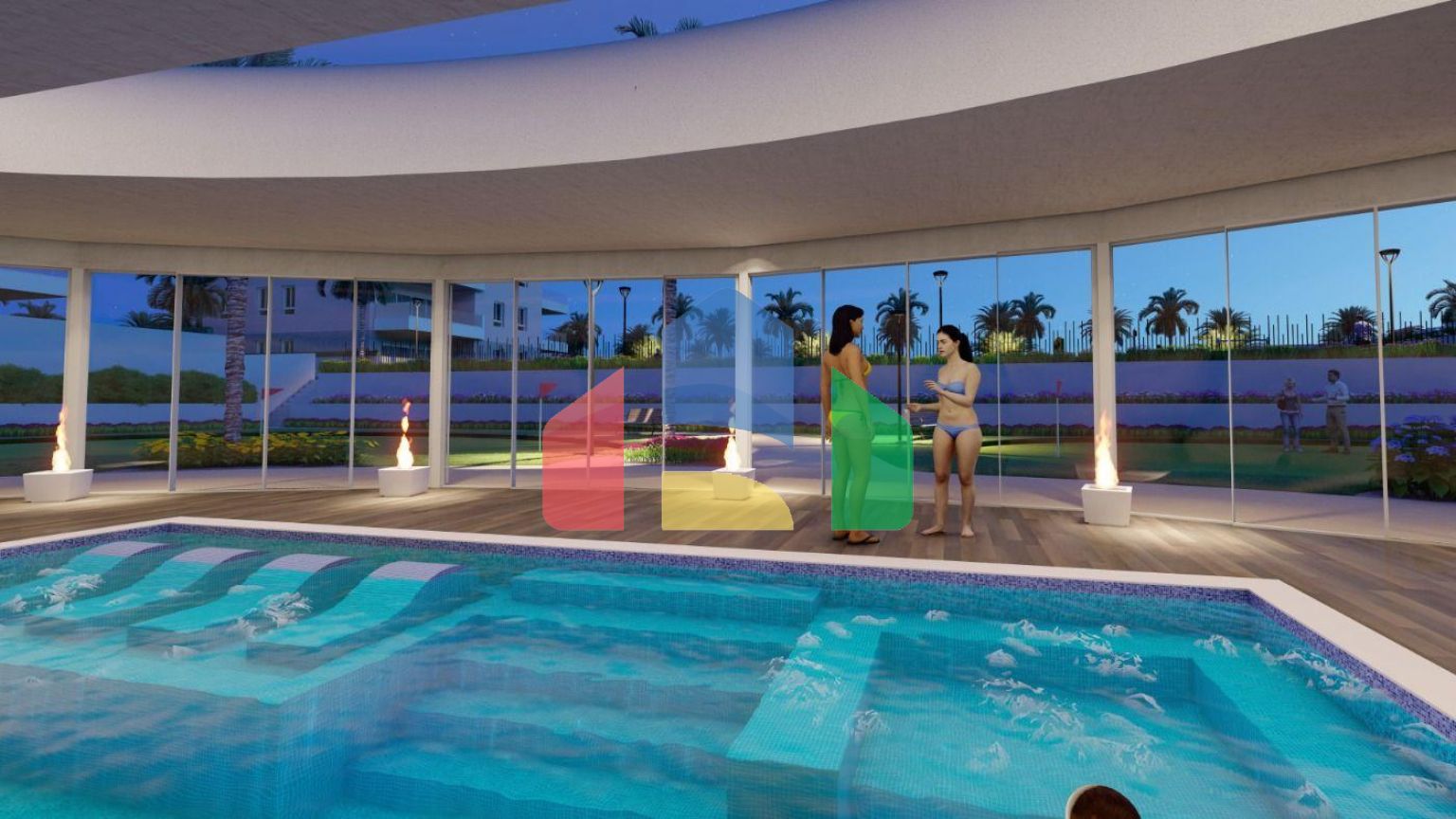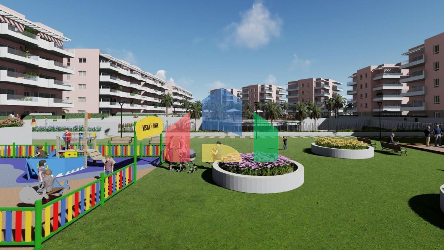 Апартаменты имеют 3 спальни, 2 ванные комнаты, салон открытого плана с кухней, первый этаж с частным садом, средний этаж с террасой и верхний этаж с частным солярием.